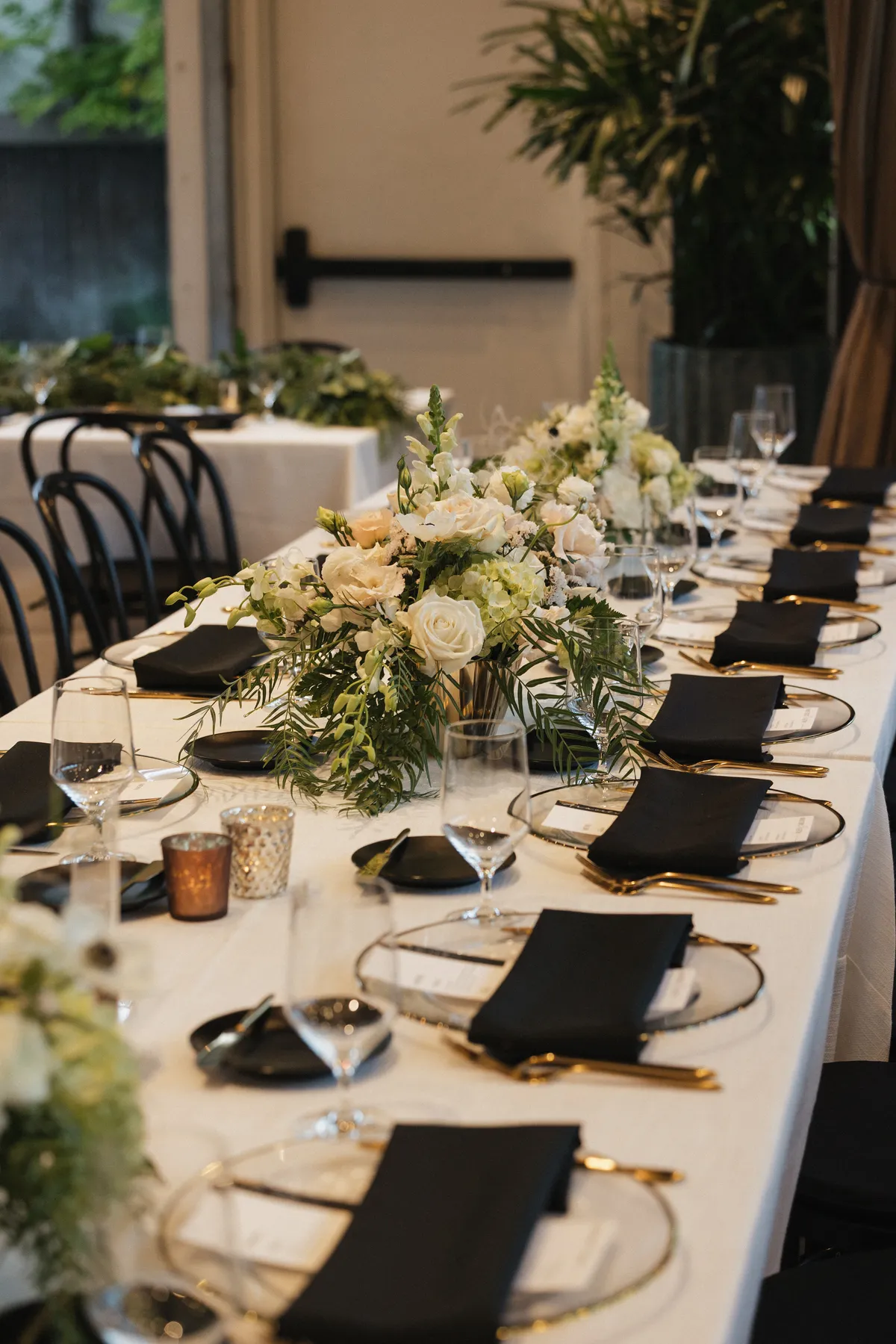 The neutral palette — brick, white walls, natural wood — works with virtually any color scheme or décor direction: modern minimalist, romantic garden, bold jewel tones, classic black and white. The venue doesn't compete with your vision; it amplifies it.